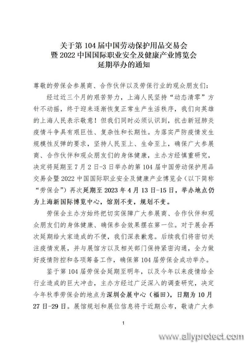經過近三個月的艱苦努力,上海人民堅持“動態清零”方針不動搖,終于迎來逐漸恢復正常生產生活秩序,我們向英雄的上海人民表示敬意!但我們同時必須認識到,抗擊新冠肺炎疫情斗爭具有艱巨性、復雜性和長期性。為落實嚴防疫情發生規模性反彈的要求,堅持人民至上、生命至上,確保廣大參展商、合作伙伴和觀眾朋友們的身體健康,主辦方經慎重研究,決定將延期至7月2日-3日舉辦的第104屆中國勞動保護用品交易會暨2022中國國際職業安全及健康產業博覽會(以下簡稱“勞保會”)再次延期至2023年4月13日-15日,舉辦地點仍為上海新國際博覽中心,館別不變,規劃不變。