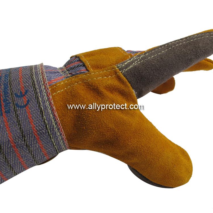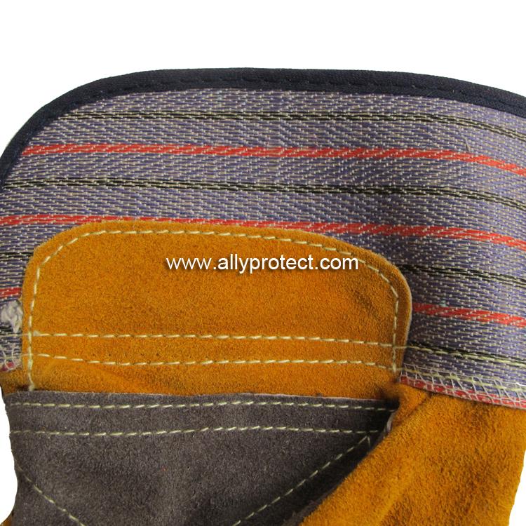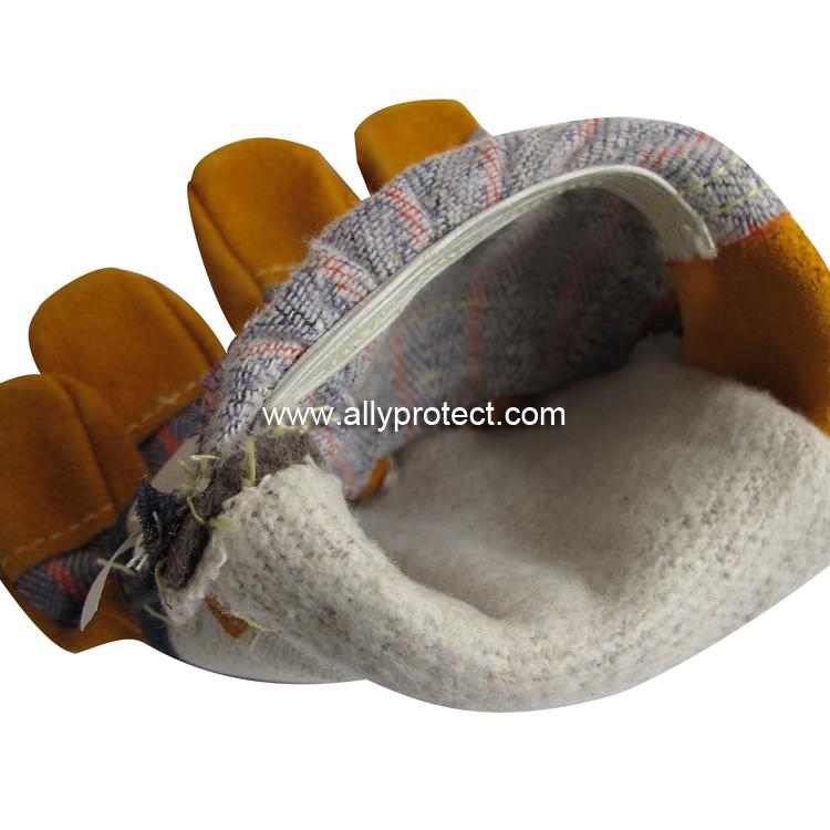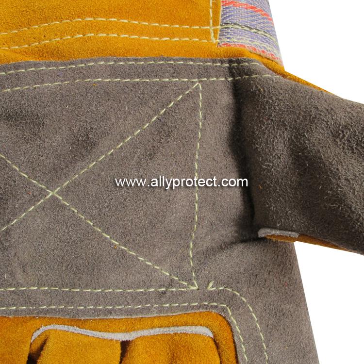 該款手套掌位部分采用耐磨、抗穿插的牛二層皮制成,質地厚實且柔軟舒適,抗穿插及內磨程度均勻;